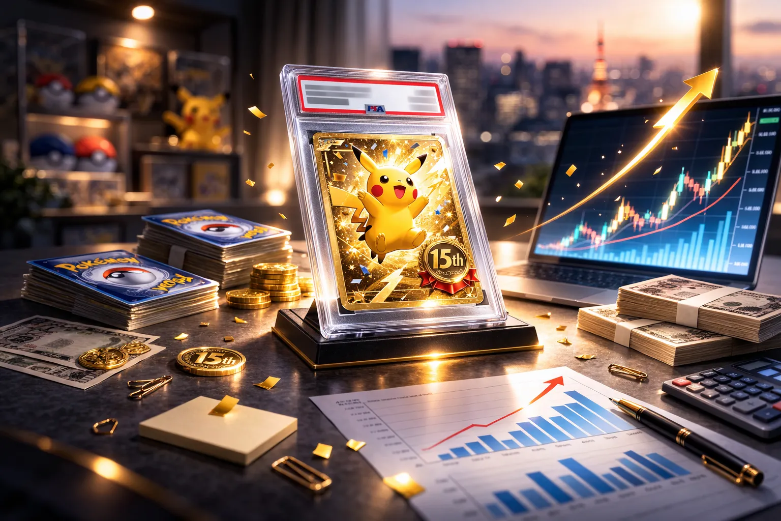 この記事では、世界的なポケモンカード市場の高騰がどのように国内相場へ波及しているのか、そして今注目されている「ピカチュウ(ポケモンセンター15周年)PSA10」の価格上昇について、背景とあわせて整理します。ニュースとして話題になった出来事と、日本のフリマ市場の動きがどう結びついているのか。その流れを追いながら、今の相場をどう見ればよいのかを考えていきます。
